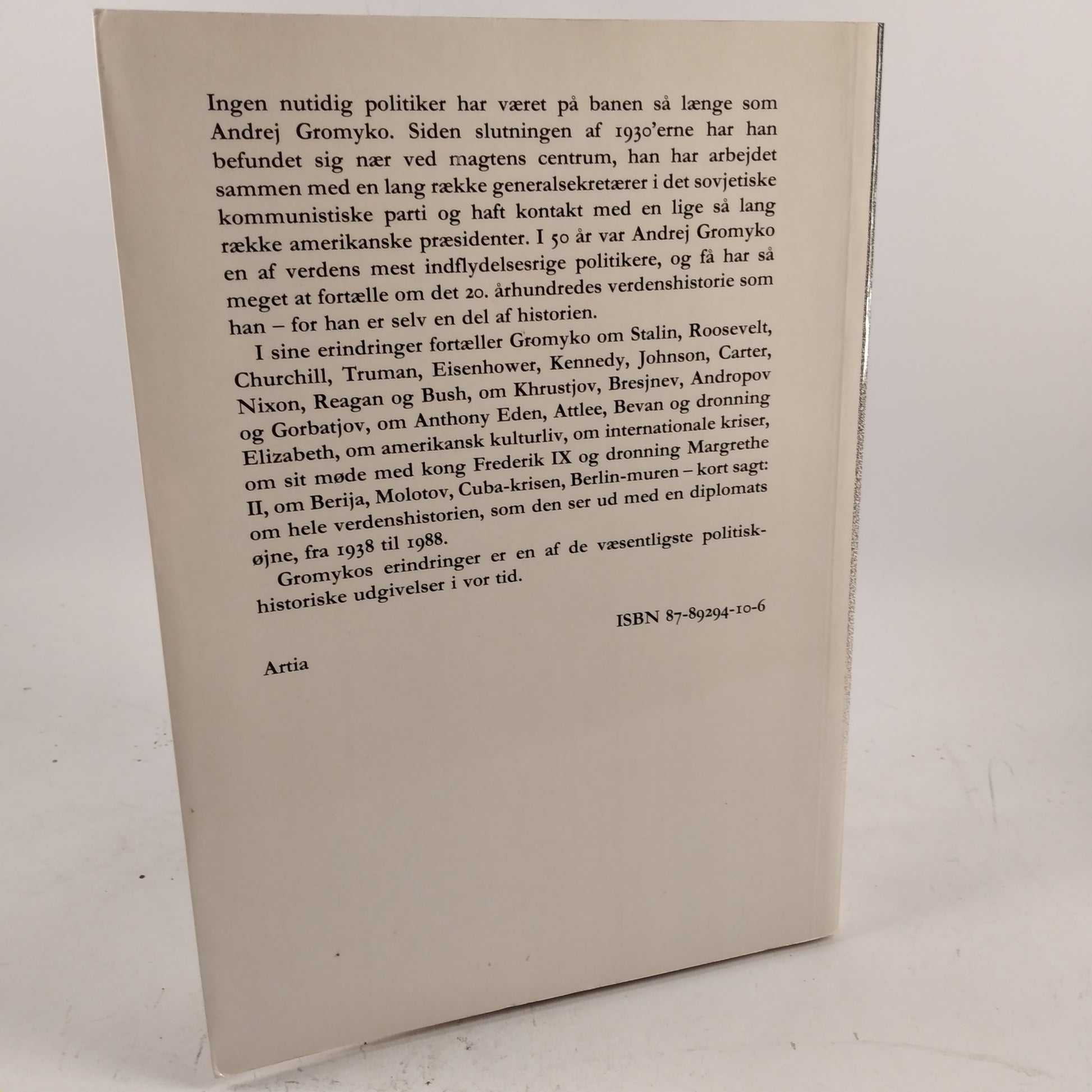 Erindringer af Andrek Gromyko. Forlaget Artia. År 1989. Hardback. 283 sider. Flot ex. ISBN:8789294122